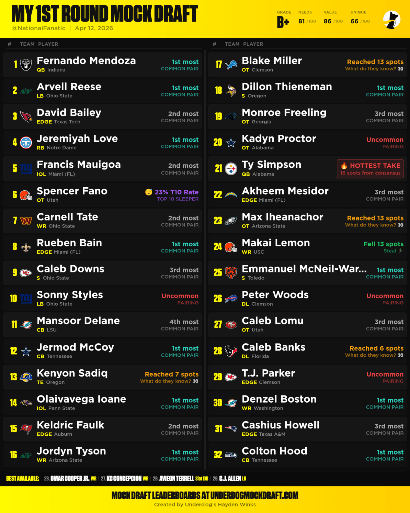 This version leans heavily into team needs, positional value, and realistic draft trends.
