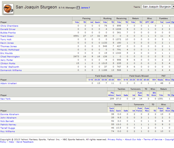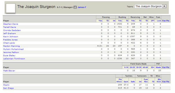 One of the bonuses of using Yahoo! Fantasy leagues; they keep your Fantasy Sports Profile. It’s no exactly 100% accurate, but it’s pretty close. I tried to get some information from my old teams, but not every roster is available, but I did find my team from 2001 (and I had Payton Manning, Terrell & LaDainian Tomlinson).